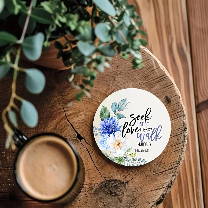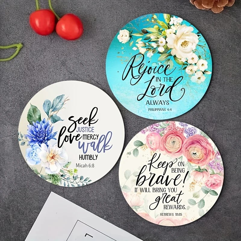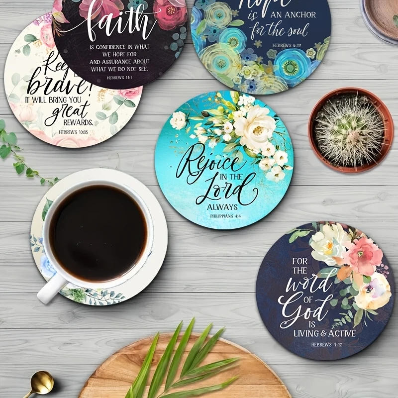 Bible Verse Coasters are a beautiful and practical addition to any faith-filled home or office space. This 6-piece set features 2D wooden coasters designed with uplifting Bible verses and elegant floral patterns. Each coaster helps protect your tabletops from heat, moisture, and scratches while adding meaningful decorative charm. Crafted from durable wood, they provide reliable insulation for hot coffee mugs, tea cups, and cold drinks. The inspirational scripture designs make every use a gentle reminder of faith and encouragement. Perfect for daily use, small gatherings, or special occasions, they blend function with spiritual style. The 4-inch size fits most mugs and glasses comfortably. Lightweight yet sturdy, they are easy to store and clean after use. These coasters also make thoughtful gifts for friends, family, church members, or housewarmings. Ideal for kitchens, offices, coffee tables, and prayer rooms, they enhance any space with warmth and purpose. The floral artwork adds a soft, welcoming touch that complements many décor styles. Choose this Bible verse coaster set to protect your surfaces while sharing inspiration with every cup.